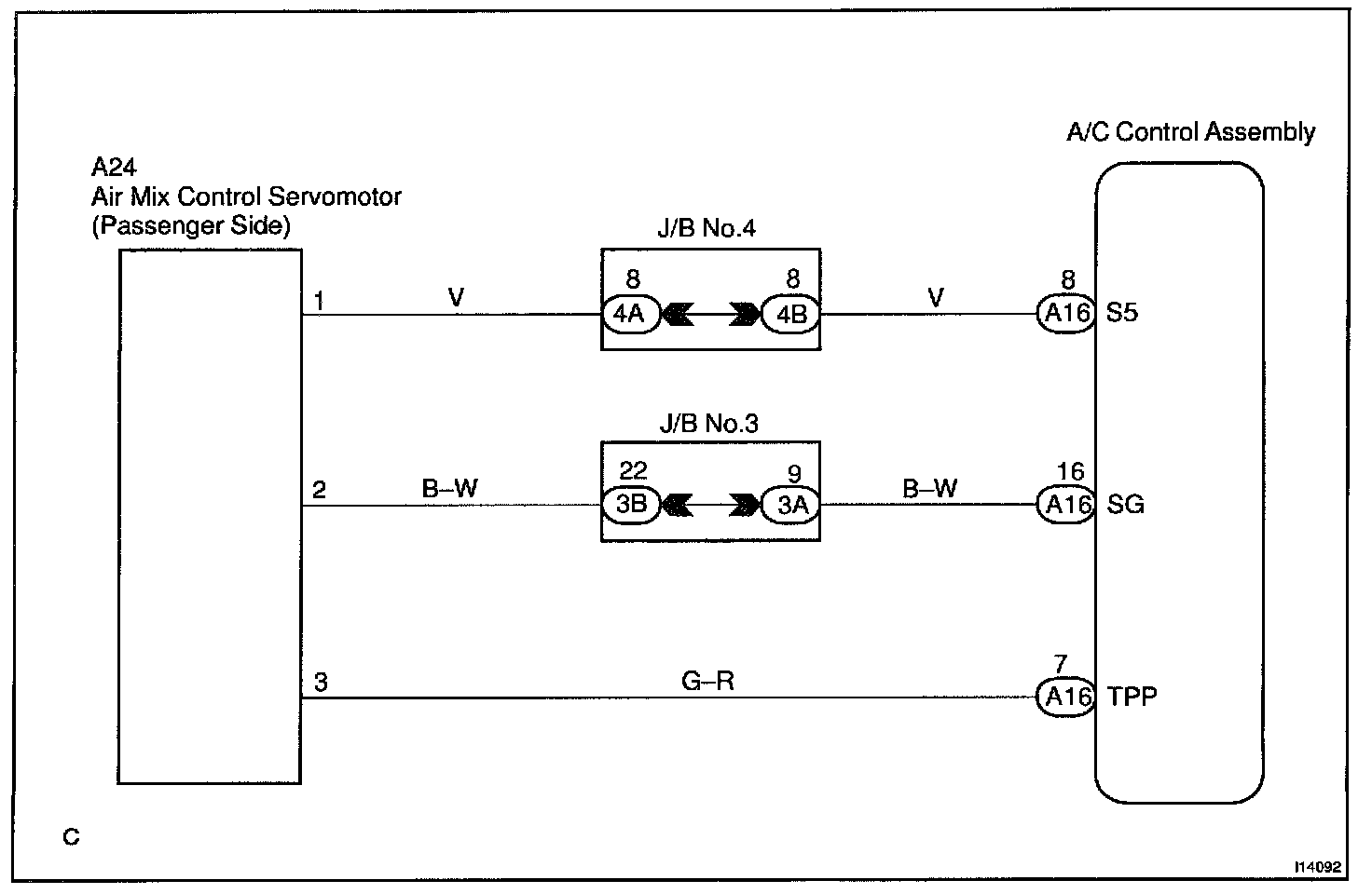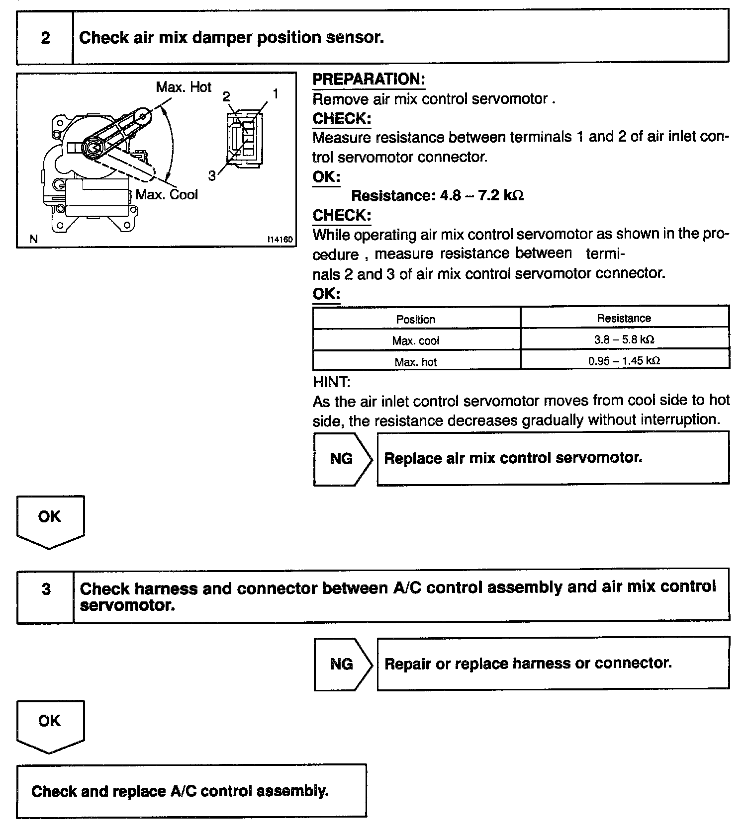 This sensor detects the position of the air inlet damper and sends the appropriate signals to the A/C control assembly. The position sensor is built into the air mix control servomotor.