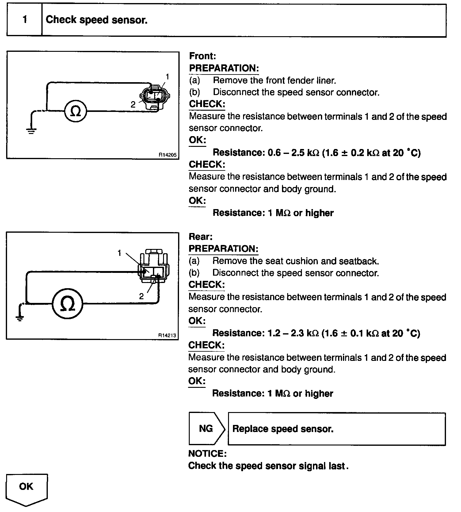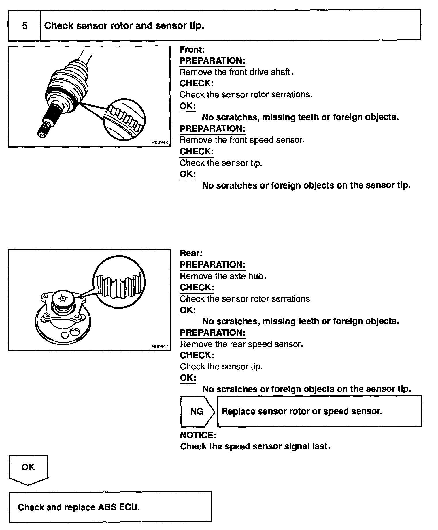 The speed sensor detects wheel speed and sends the appropriate signals to the ECU. These signals are used to control the ABS system. Each of the front and rear rotors has 48 serrations.