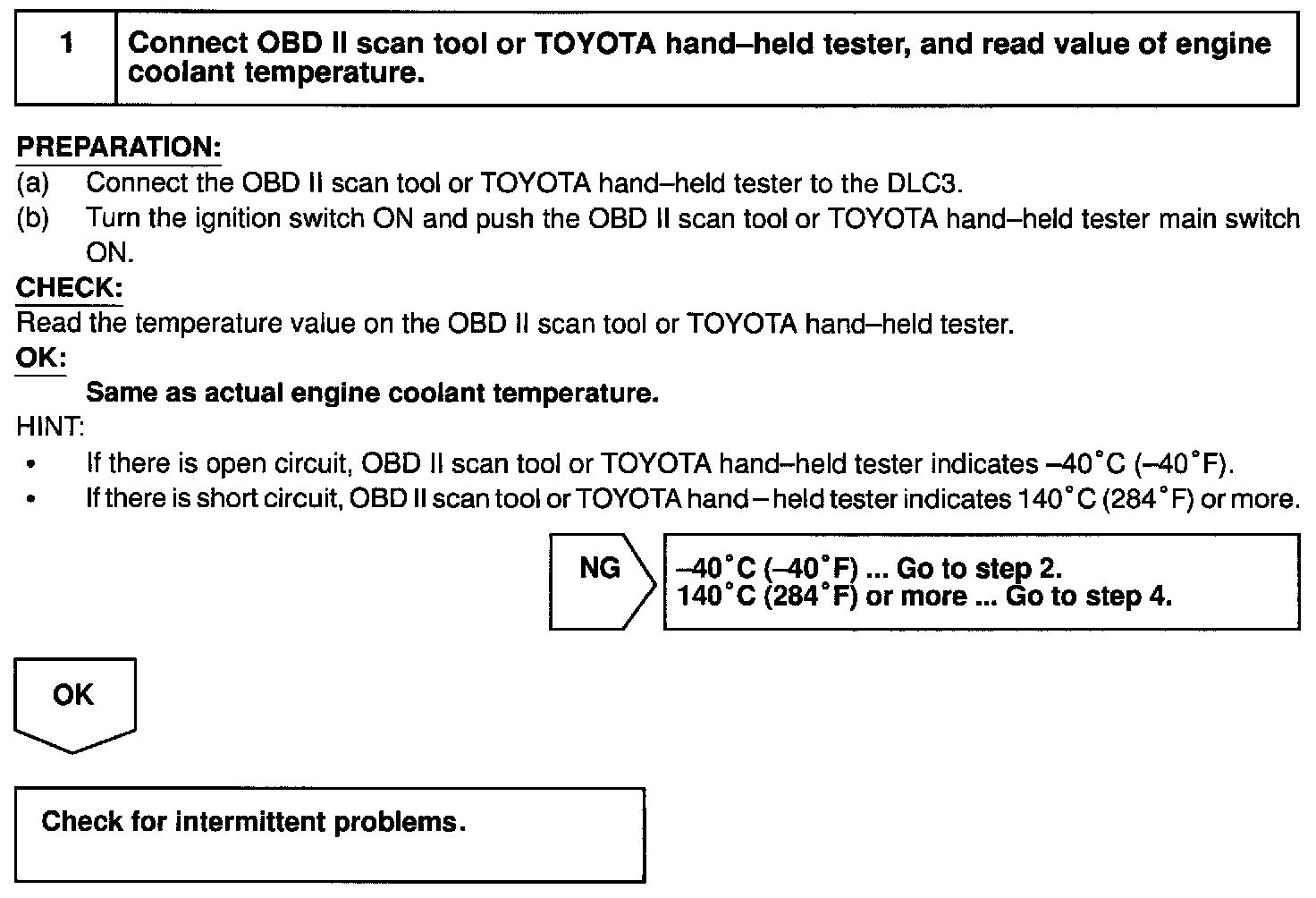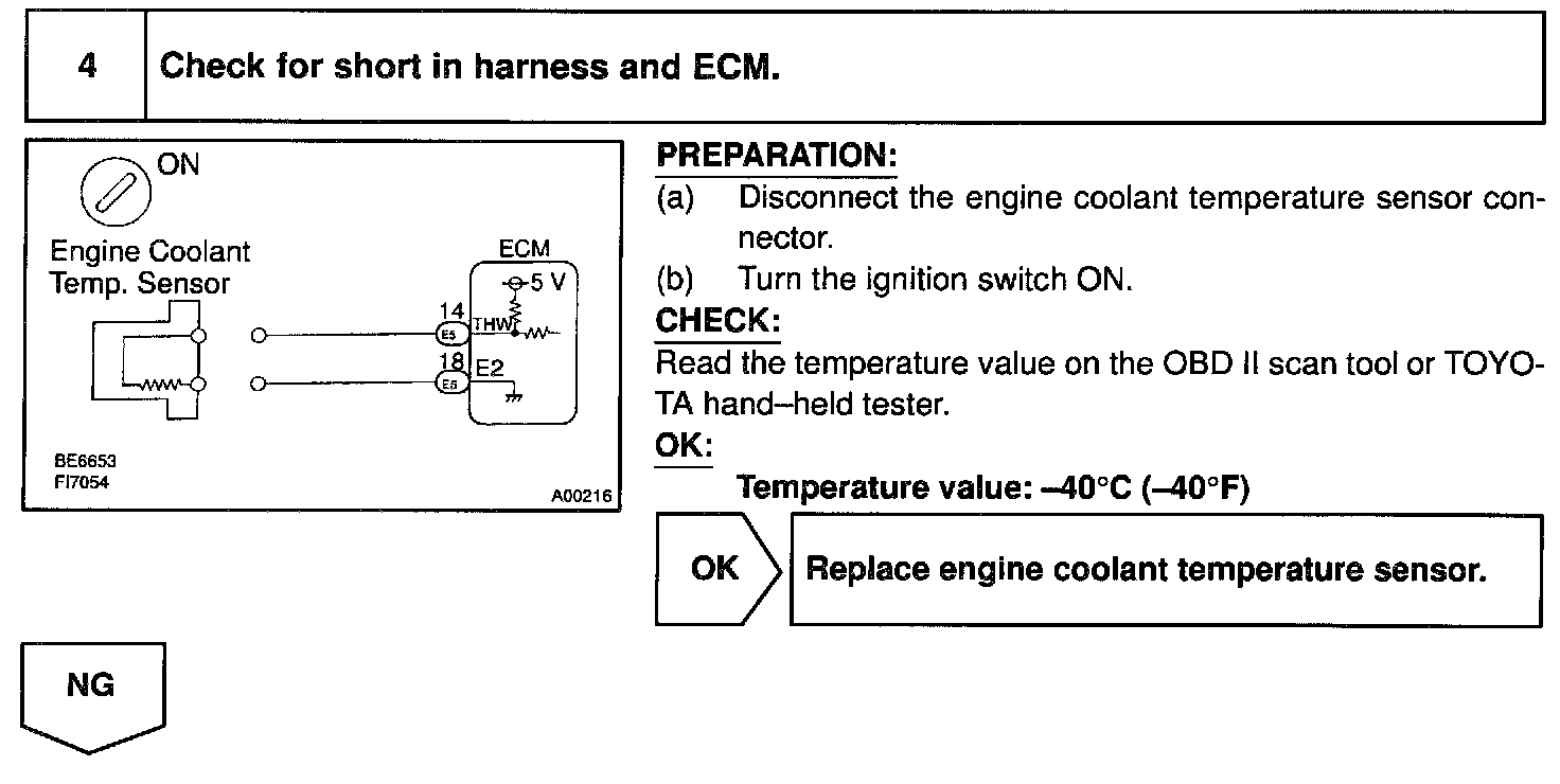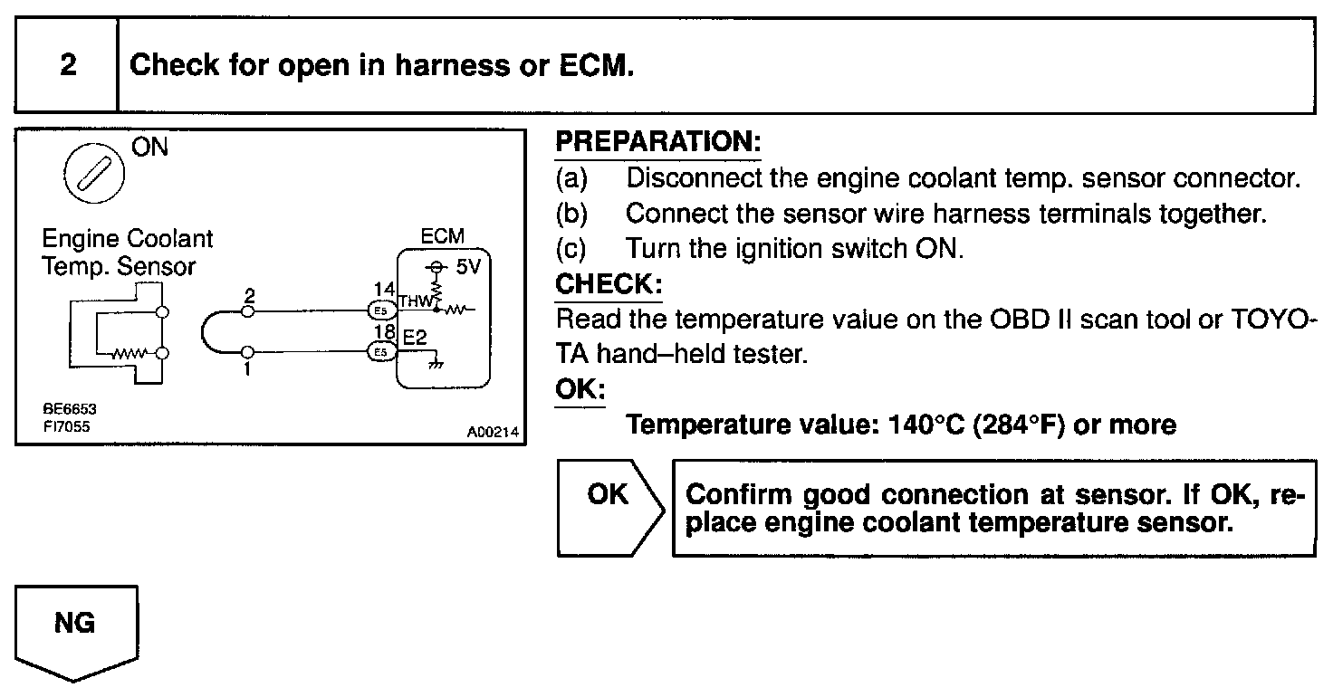 HINT: After confirming DTC P0115, use the OBD II scan tool or TOYOTA hand-held tester to confirm the engine coolant temperature from the CURRENT DATA.