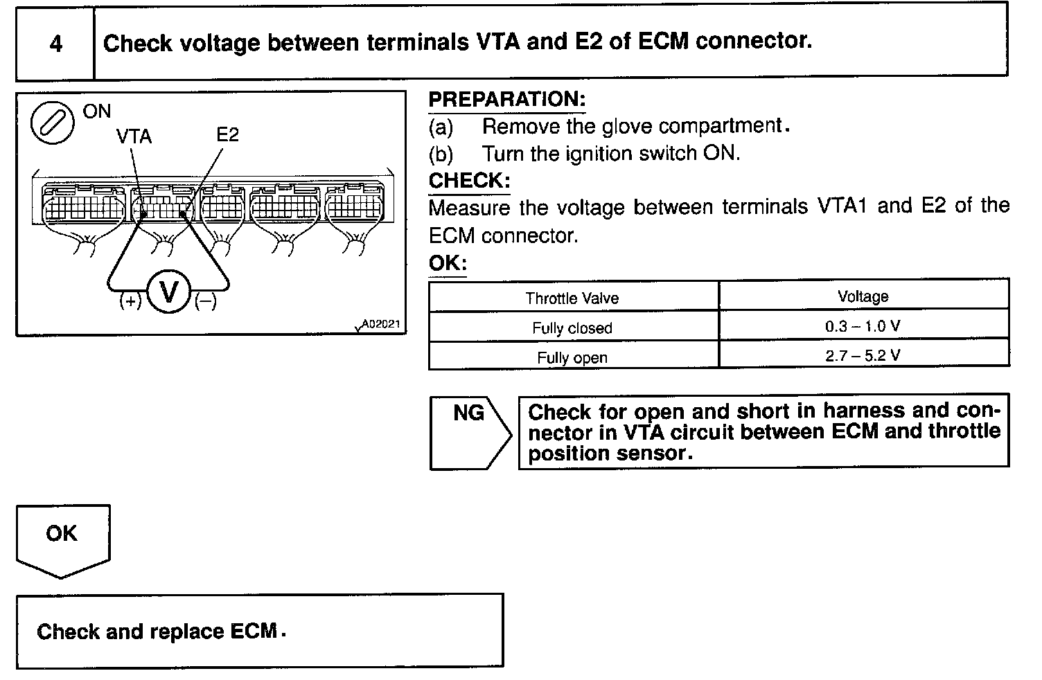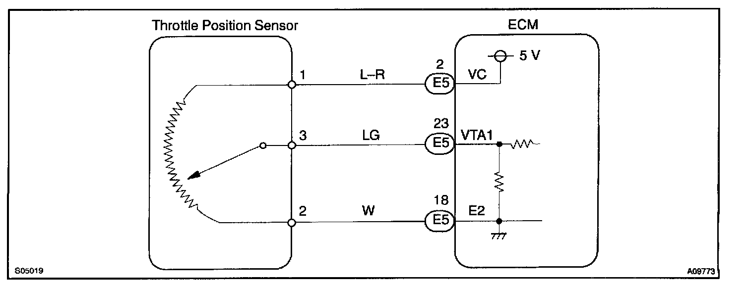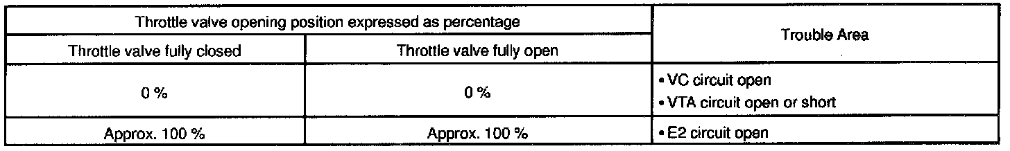 The throttle position sensor is mounted in the throttle body and detects the throttle valve opening angle. When the throttle valve is fully closed, a voltage of approximately 0.7 V is applied to terminal VTA of the ECM. The voltage applied to terminals VTA of the ECM increases in proportion to the opening angle of the throttle valve and becomes approximately 2.7-5.2 V when the throttle valve is fully opened. The ECM judges the vehicle driving conditions from these signals input from terminals VTA and uses them as one of the conditions for deciding the air-fuel ratio correction, power increase correction and fuel-cut control etc.