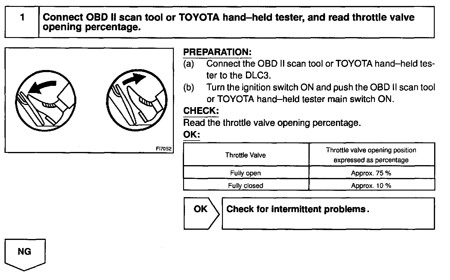 HINT: After confirming DTC P0120, use the OBD II scan tool or TOYOTA hand-held tester to confirm the throttle valve opening percentage and closed throttle position switch condition.