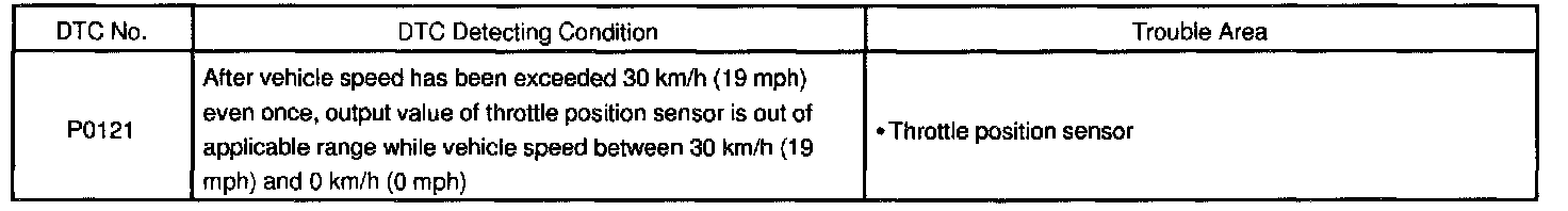 The throttle position sensor is mounted in the throttle body and detects the throttle valve opening angle. When the throttle valve is fully closed, a voltage of approximately 0.7 V is applied to terminal VTA of the ECM. The voltage applied to terminals VTA of the ECM increases in proportion to the opening angle of the throttle valve and becomes approximately 2.7-5.2 V when the throttle valve is fully opened. The ECM judges the vehicle driving conditions from these signals input from terminals VTA and uses them as one of the conditions for deciding the air-fuel ratio correction, power increase correction and fuel-cut control etc.