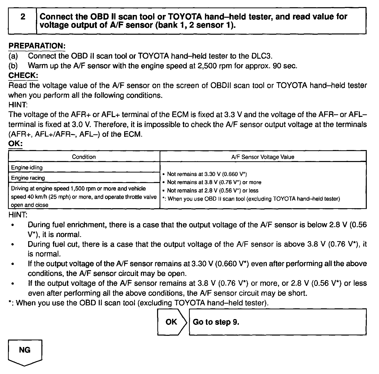 - OBD II scan tool (excluding TOYOTA hand-held tester) displays the one fifth of the A/F sensor output voltage which is displayed on the TOYOTA hand-held tester.