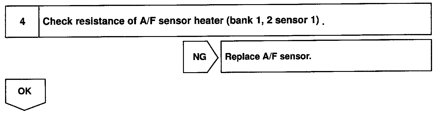 The A/F sensor is equipped with a heater which heats the zirconia element. The heater is controlled by the ECM. When the intake air volume is low (the temp. of the exhaust gas is low), current flows to the heater to heat the sensor for accurate oxygen concentration detection.