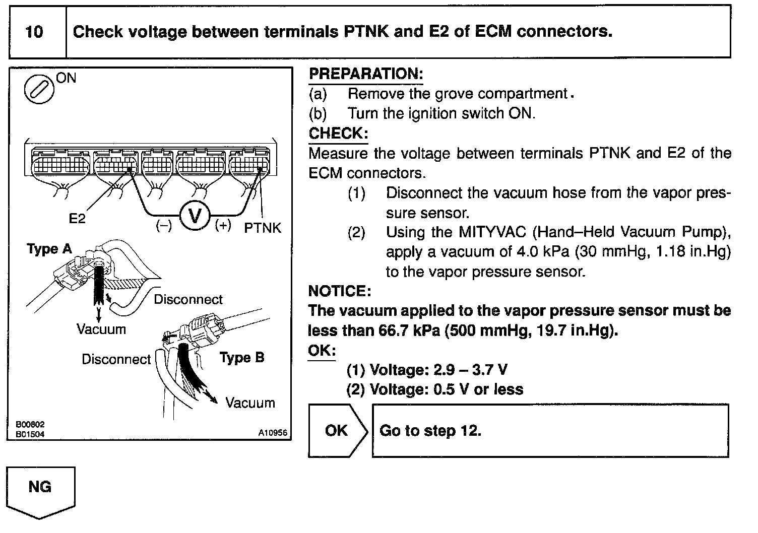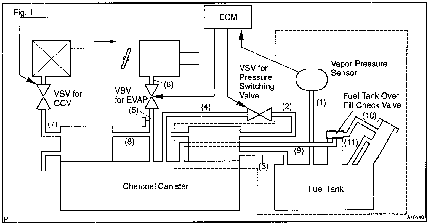DTC P0440 or P0442 is recorded by the ECM when evaporative emissions leak from the components within the dotted line in Fig. 1 above, or when the vapor pressure sensor malfunctions.