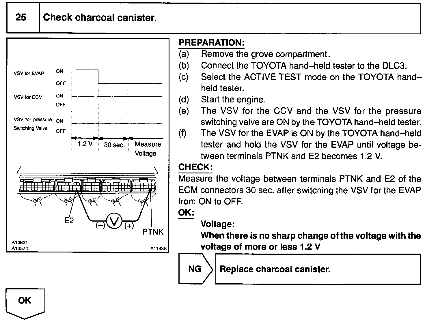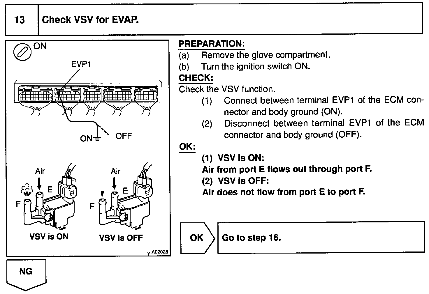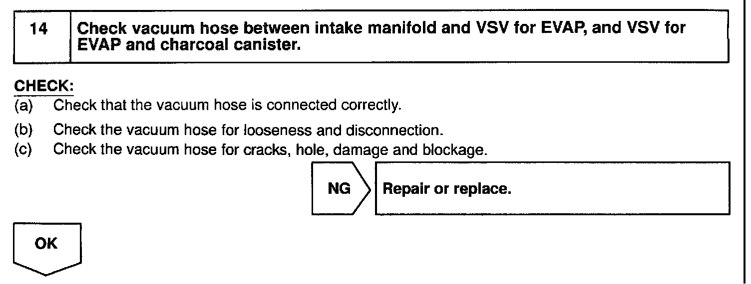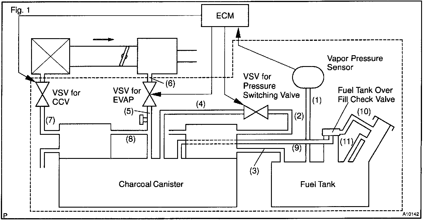 DTCs P0441 and P0446 are recorded by the ECM when evaporative emissions leak from the components within the dotted line in Fig. 1 below, or when there is a malfunction in either the VSV for EVAP the VSV for pressure switching valve, or in the vapor pressure sensor itself.