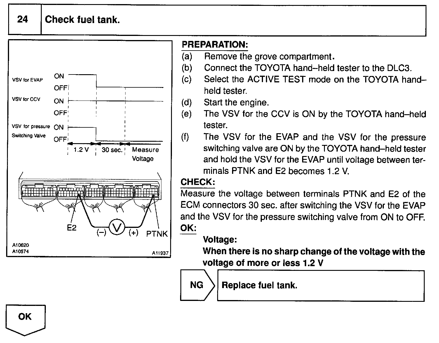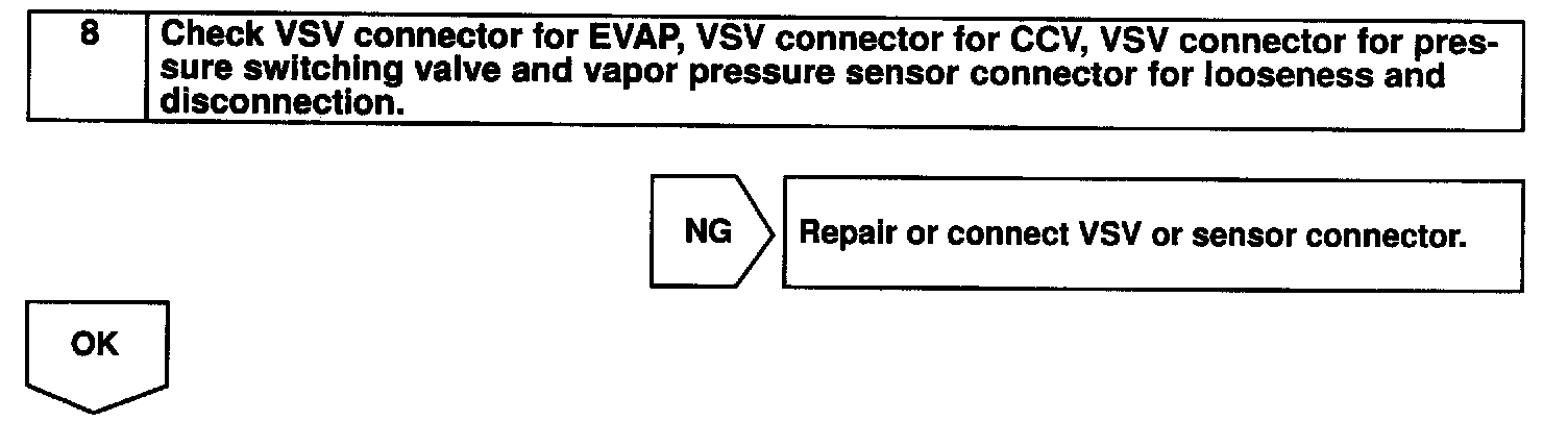 The vapor pressure sensor, VSV for canister closed valve (CCV), VSV for pressure switching valve are used to detect abnormalities in the evaporative emission control system.