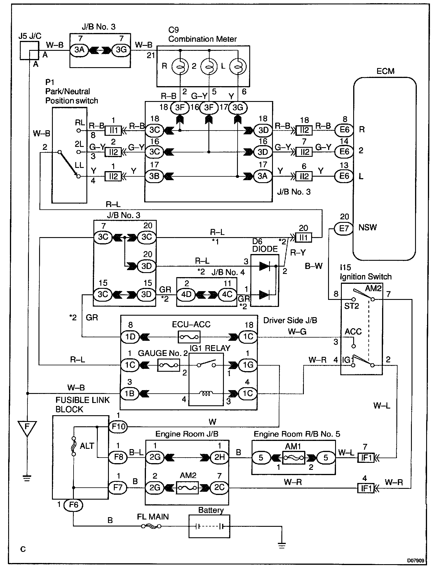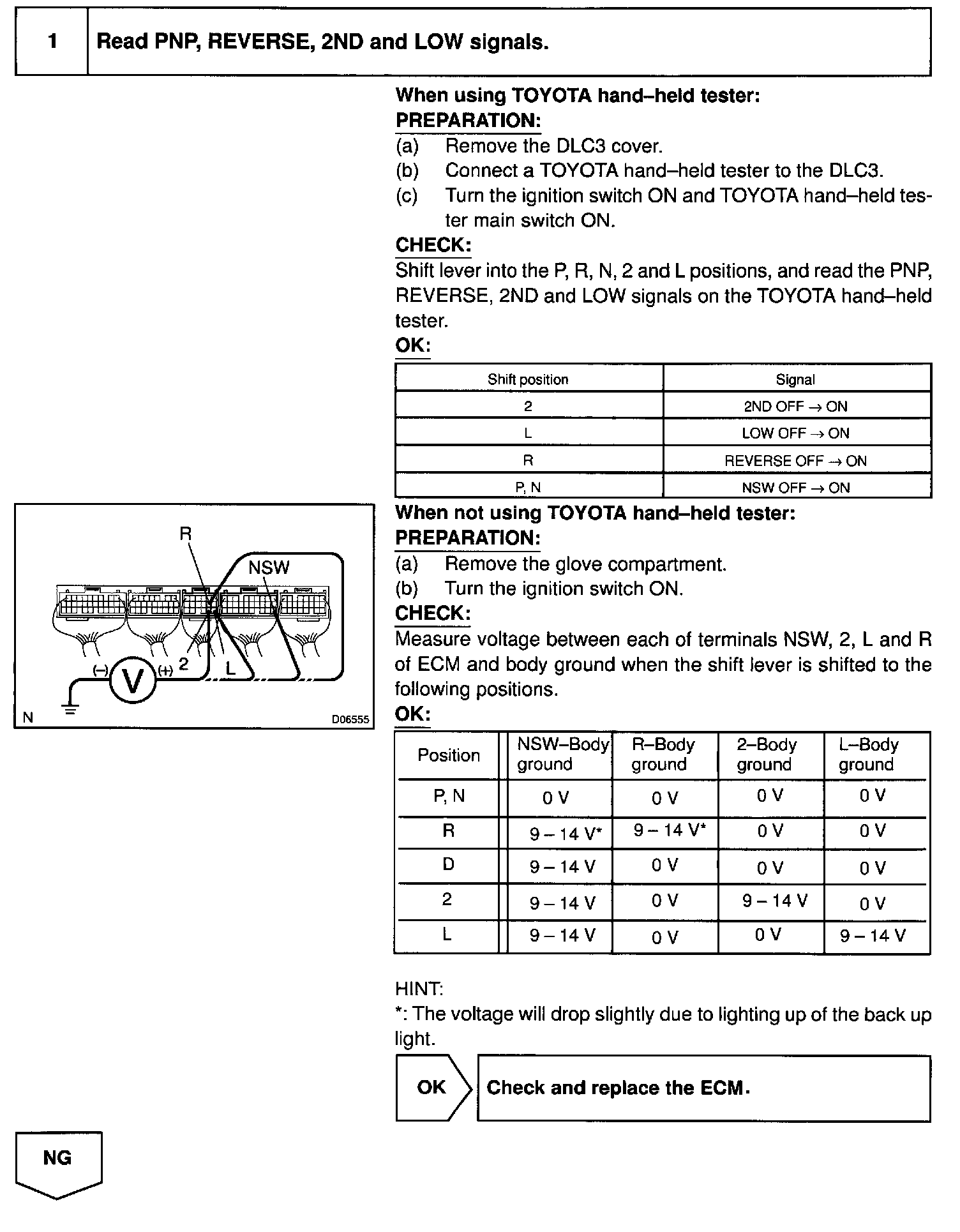 The ECM receives signals (NSW, R, 2 and L) from the park/neutral position switch. When the signa is not sent to the ECM from the park/neutral position switch, the ECM judges that the shift lever is in D position.
