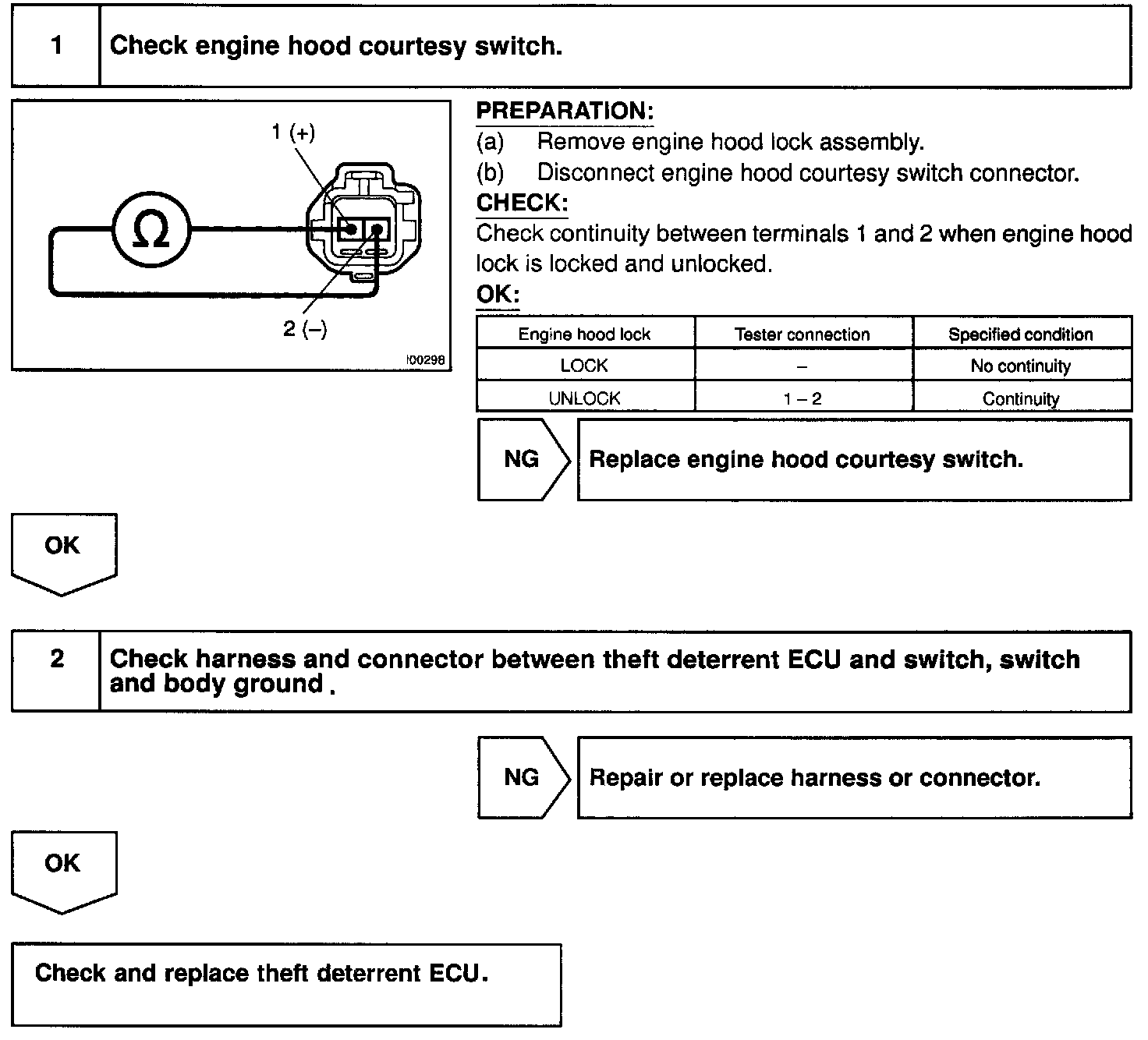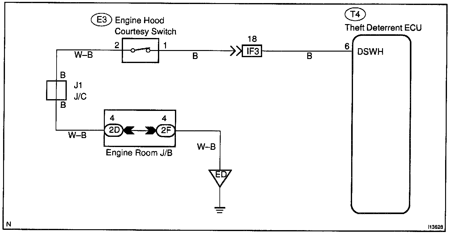 CIRCUIT DESCRIPTIONThe engine hood courtesy switch is built into the engine hood lock assembly and goes ON when the engine hood is opened and goes OFF when the engine hood is closed.