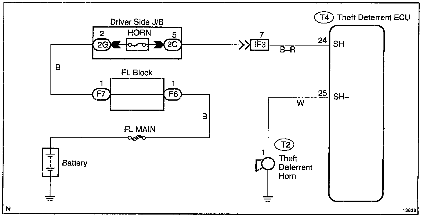 CIRCUIT DESCRIPTIONWhen the theft deterrent system is activated, the relay in the ECU turns ON and OFF cycles of approximately 0.2 sec., causing the theft deterrent horn to blow (See the wiring diagram).