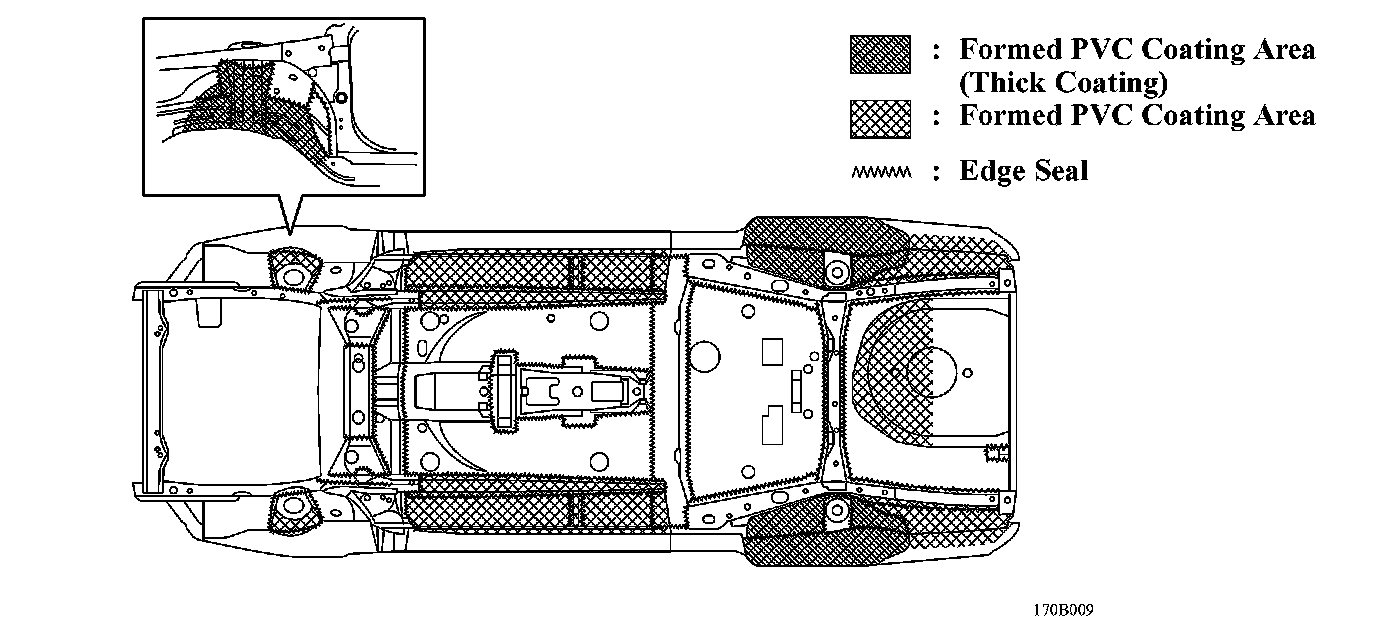 Formed PVC (Polyvinyl Chloride) coating is applied to the under side of the body. A thick coating to improve rust resistant performance is applied to the front and rear wheel houses, the fender apron and other parts which are subject to damage by stone chipping.