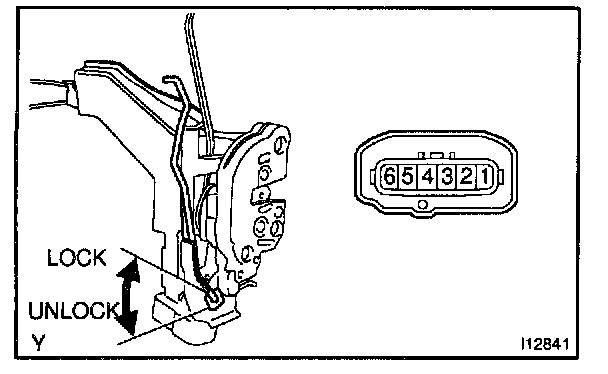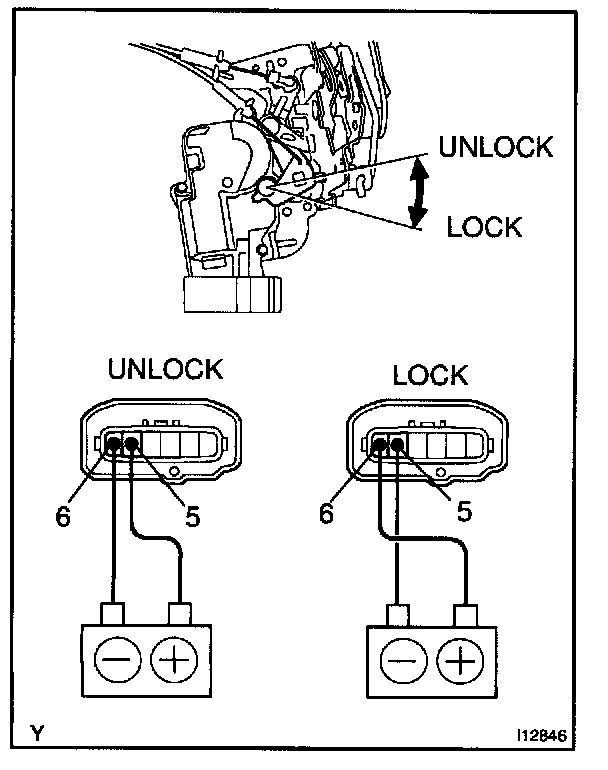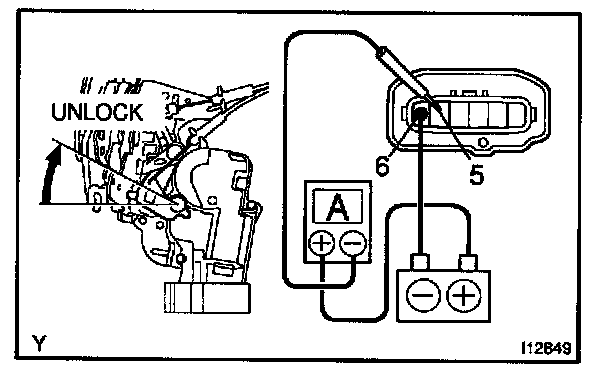 a. Connect the positive (+) lead from the battery to terminal 5 and the negative (-) lead to terminal 6, and check that the door lock link moves to UNLOCK position.