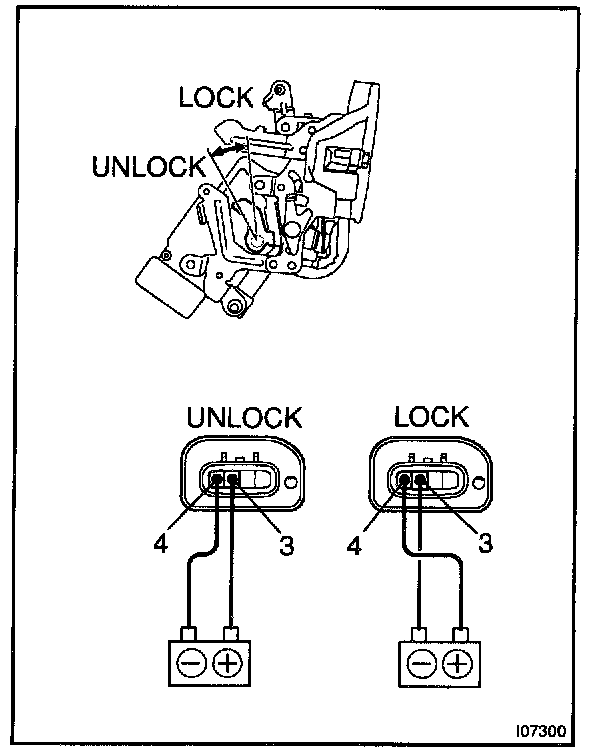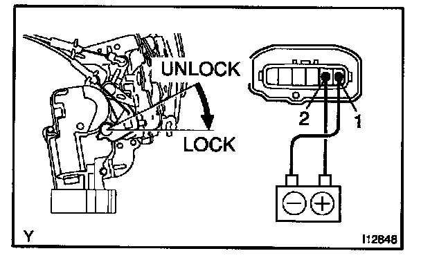 a. Connect the positive (+) lead from the battery to terminal 1 and the negative (-) lead to terminal 2, and check that the door lock link moves to UNLOCK position.