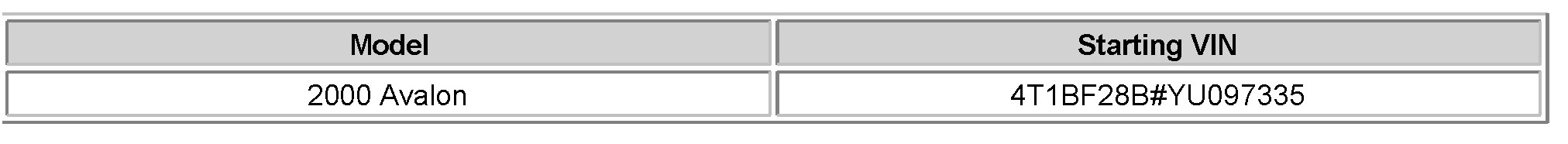 2000 model year Avalon vehicles.