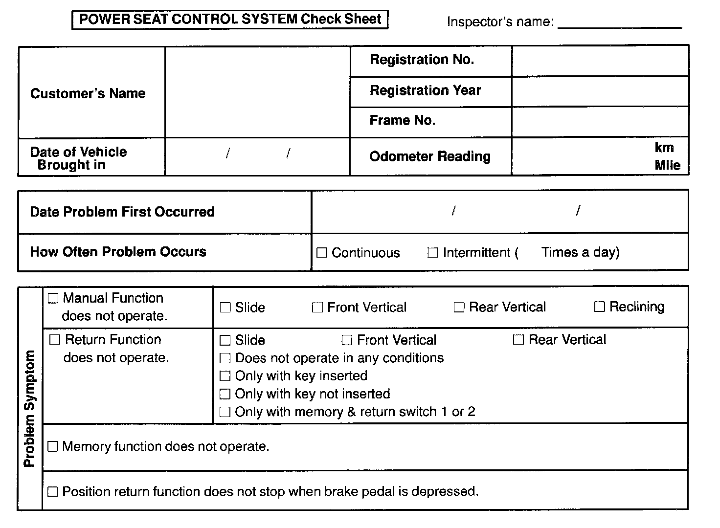 Power Seat Control Check Sheet / W/ Driving Position Memory: