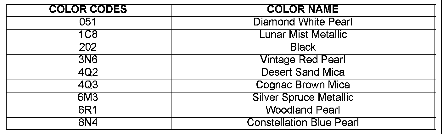 The following information outlines exterior body color codes used on the 2000 Avalon. The color code can be found on the certification regulation label, which is located on the driver's side doorjamb.