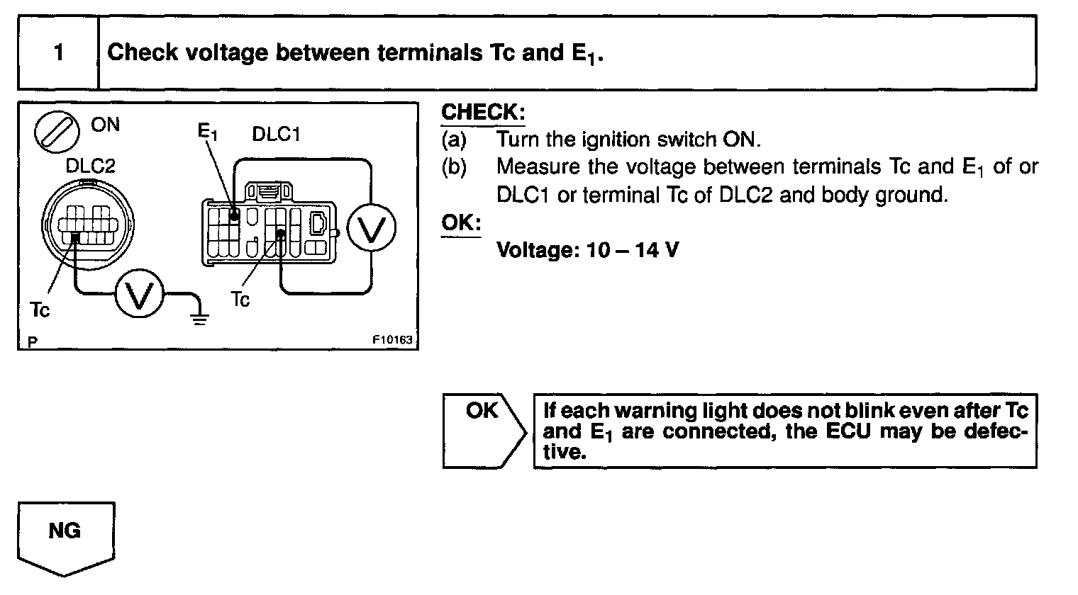 CIRCUIT DESCRIPTIONConnecting between terminals Tc and E1 of the DLC1 or the DLC2 causes the ECU to display DTC by blinking the ABS warning light, VSC warning light and BRAKE warning light.