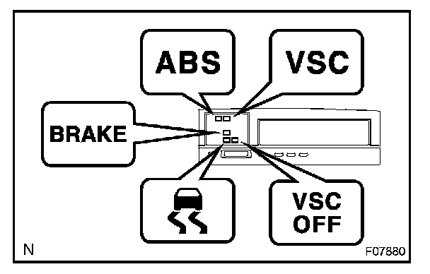 - If the indicator check result is not normal, proceed to troubleshooting for the ABS warning light circuit, VSC warning light circuit, VSC OFF indicator light circuit, BRAKE warning light circuit or SLIP indicator light circuit.