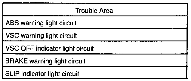 - If the indicator check result is not normal, proceed to troubleshooting for the ABS warning light circuit, VSC warning light circuit, VSC OFF indicator light circuit, BRAKE warning light circuit or SLIP indicator light circuit.