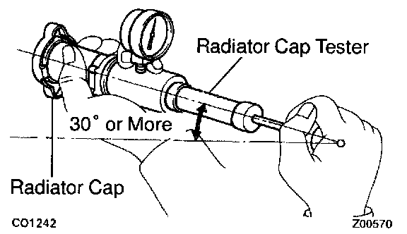 ^ When performing steps a. and b. below, keep the radiator cap tester at an angle of over 30° above the horizontal.