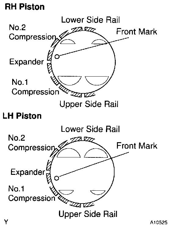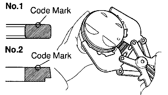b. Using a piston ring expander, install the 2 compression rings with the code mark facing upward.