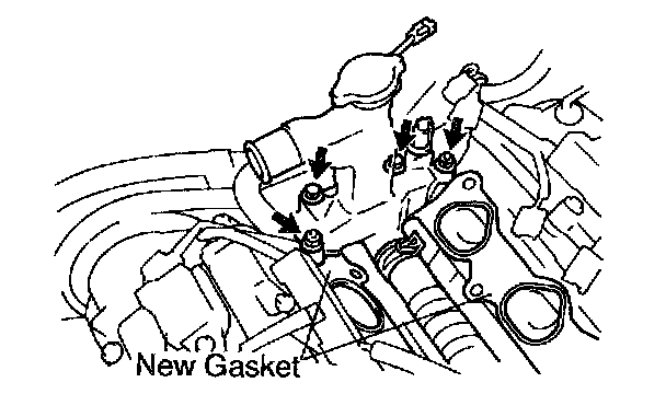 c. Install the water outlet with the 2 bolts, 2 nuts and 2 plate washers. Alternately tighten the bolts and nuts.