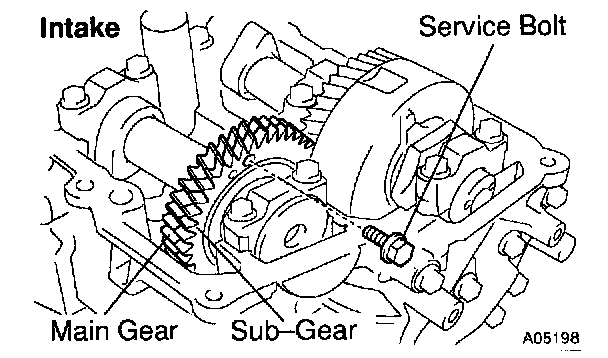 2) Secure the exhaust camshaft sub-gear to the main gear with a service bolt.