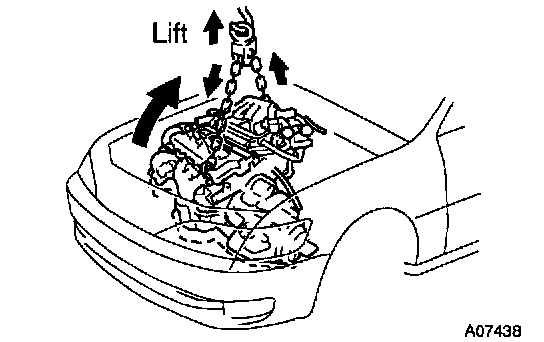 b. Lower the engine into the engine compartment. Tilt the transaxle downward, lower the engine and clear the LH mounting.