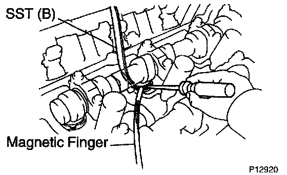 3) Using Special Service Tool (SST) (A), press down the valve lifter and place SST (B) between the camshaft and valve lifter. Remove SST (A).