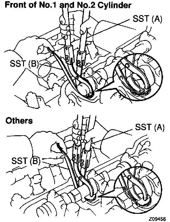 2) Press down the valve lifter with SST (A), and remove SST (B).