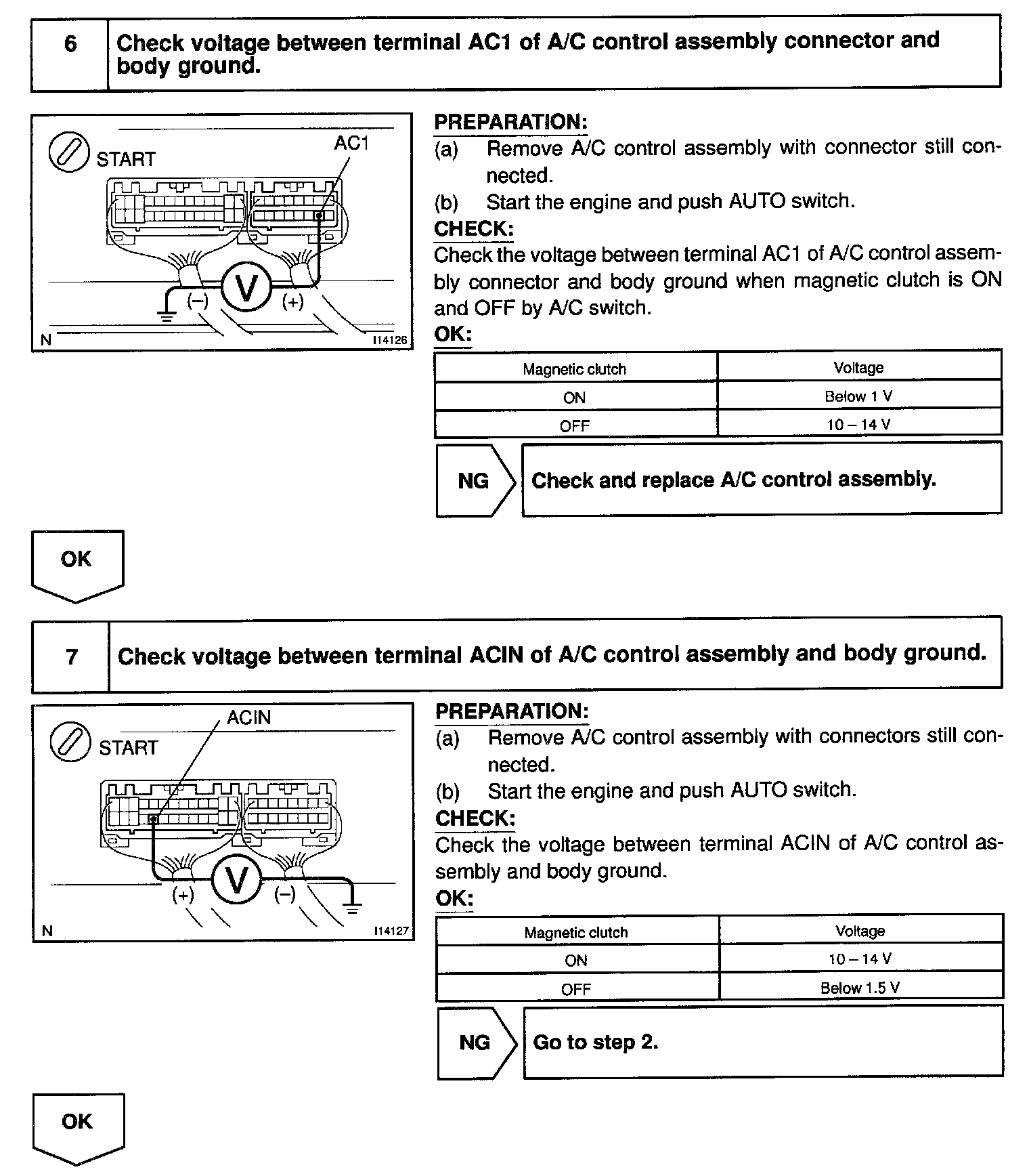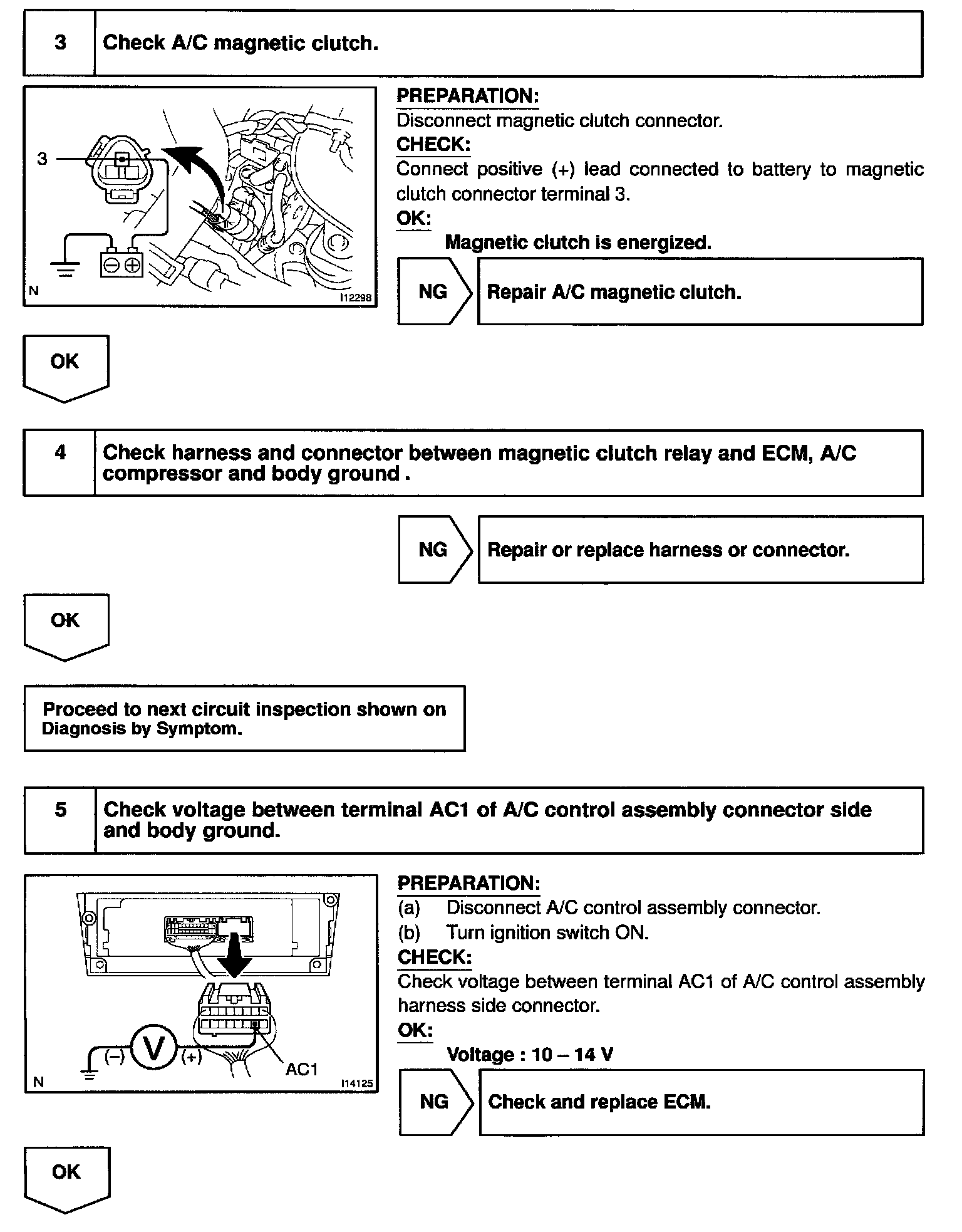 The A/C control assembly outputs the magnetic clutch ON signal from terminal AC1 to the ECM. When the ECM receives this signal, it sends a signal from terminal ACMG and switches the A/C magnetic clutch relay ON, thus turning on the A/C magnetic clutch.