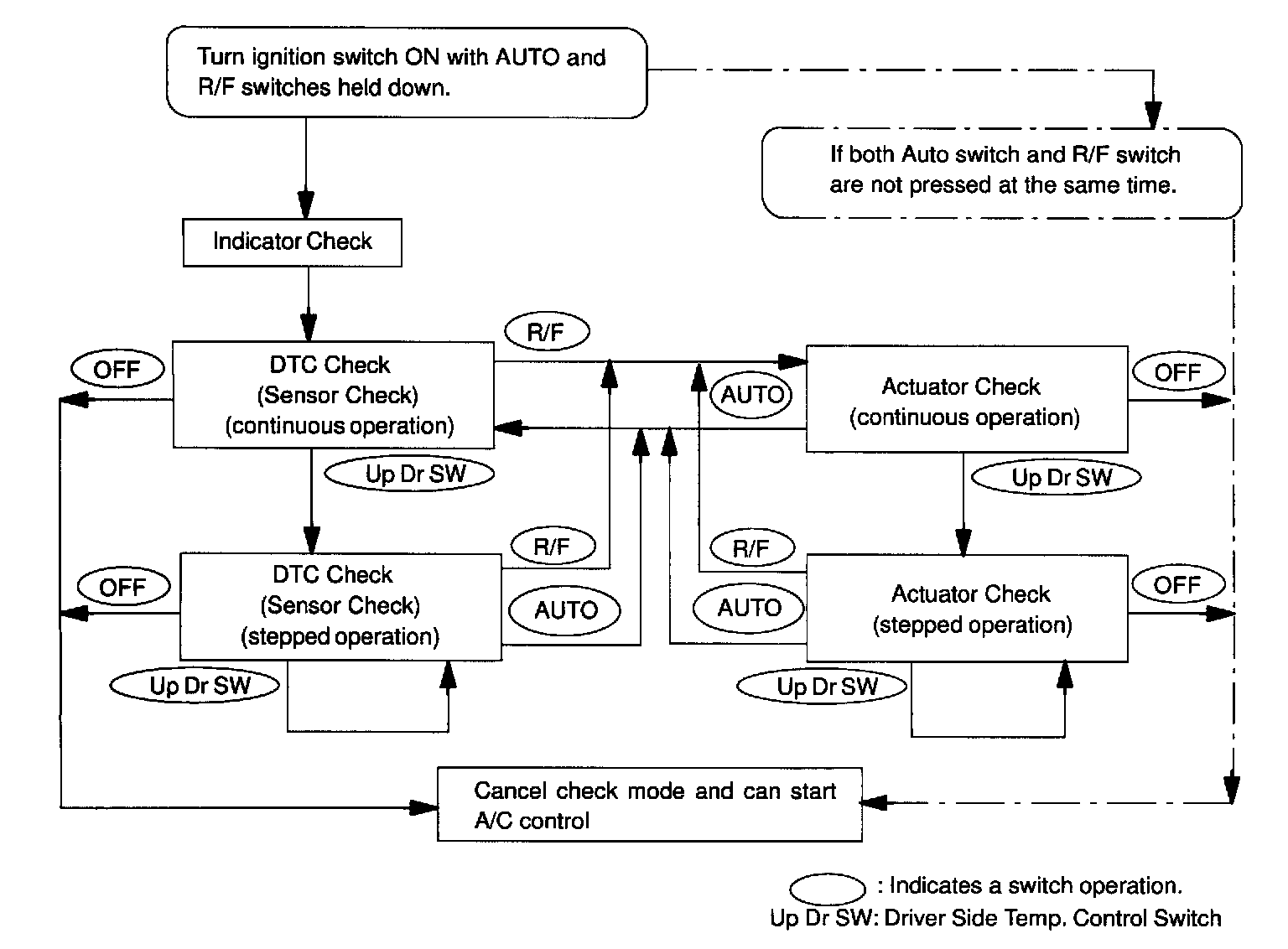By operating each of the A/C control switches as shown in the diagram, it is possible to enter the diagnosis check mode.