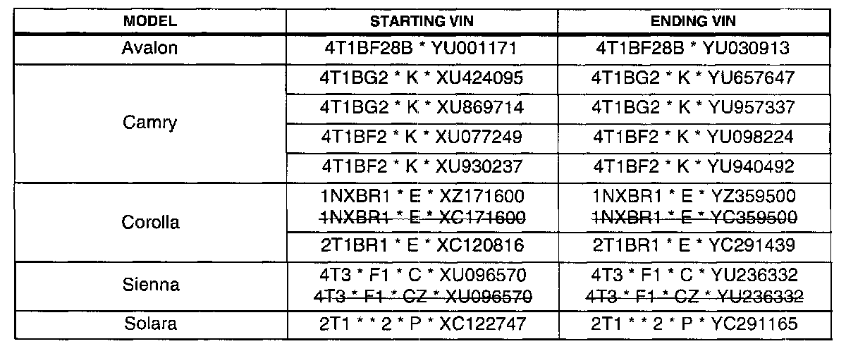 ^ 1999 - 2000 model year Camry, Corolla, Sienna, & Solara, and 2000 model year Avalon between the VINs shown.
