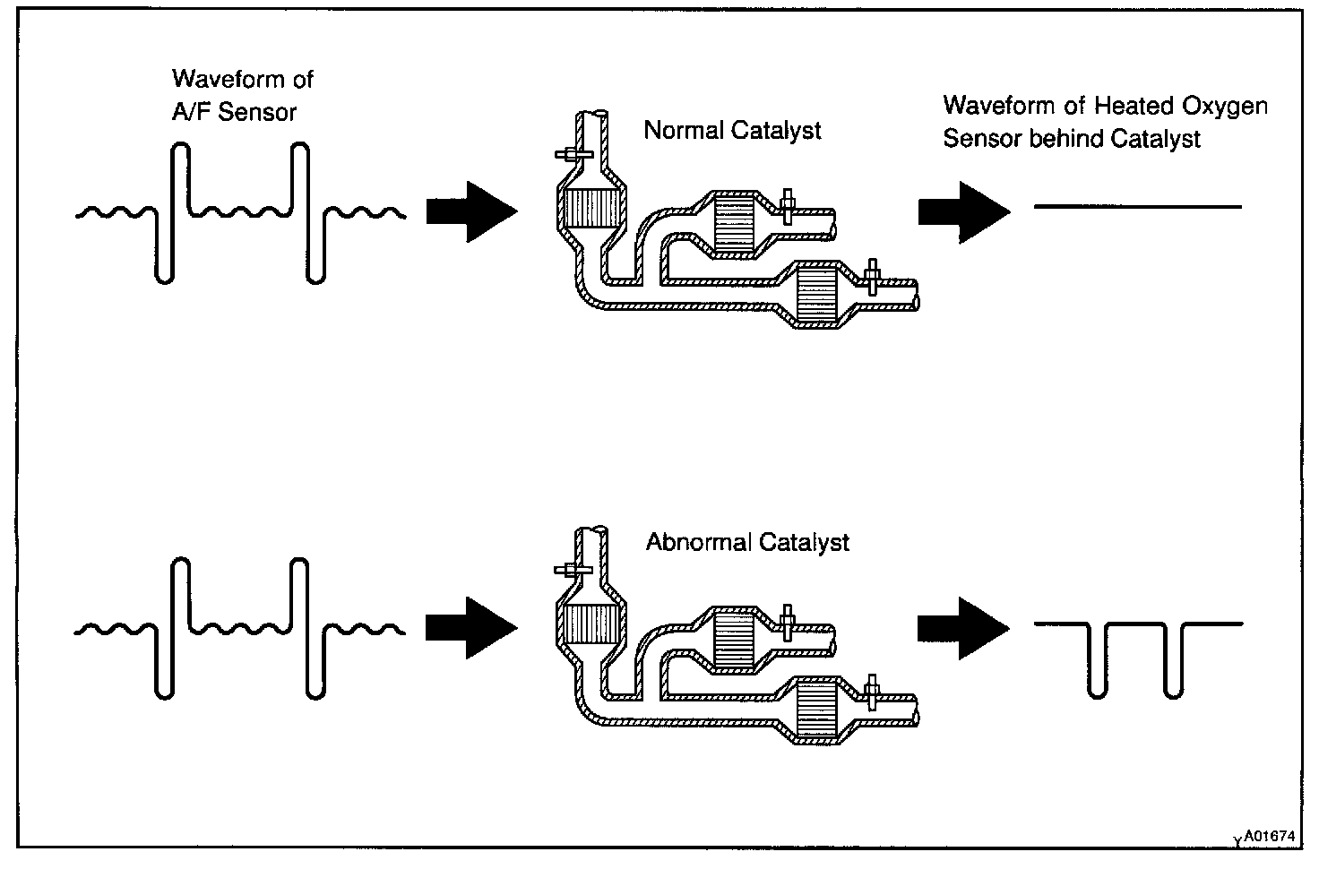 When the waveform of the heated oxygen sensor located behind the catalyst alternates flutteringly between rich and lean, it indicates that catalyst performance has deteriorated.