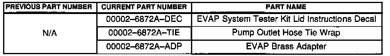 In an effort to expand the diagnostic capabilities of the EVAP System Pressure Tester and prevent inadvertent misuse of the tester pressure pump, the EVAP System Pressure Tester Kit, P/N 00002-6872A has been upgraded with the following components: