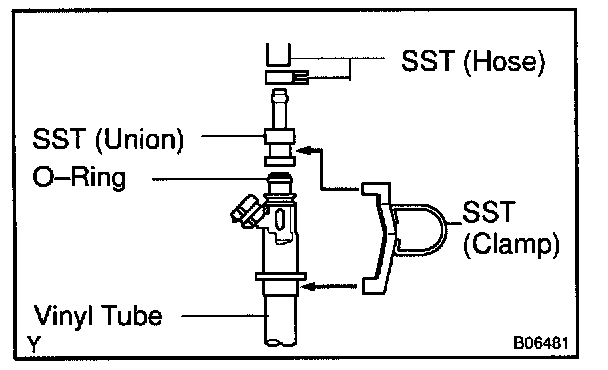d. Connect SST (union and hose) to the injector, and hold the injector and union with SST (clamp).