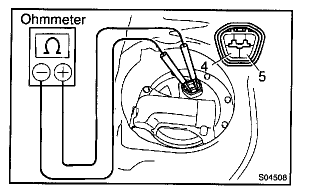 Connect the positive (+) lead from the battery to terminal 4 of the connector, and the negative (-) lead to terminal 5. Check that the fuel pump operates.