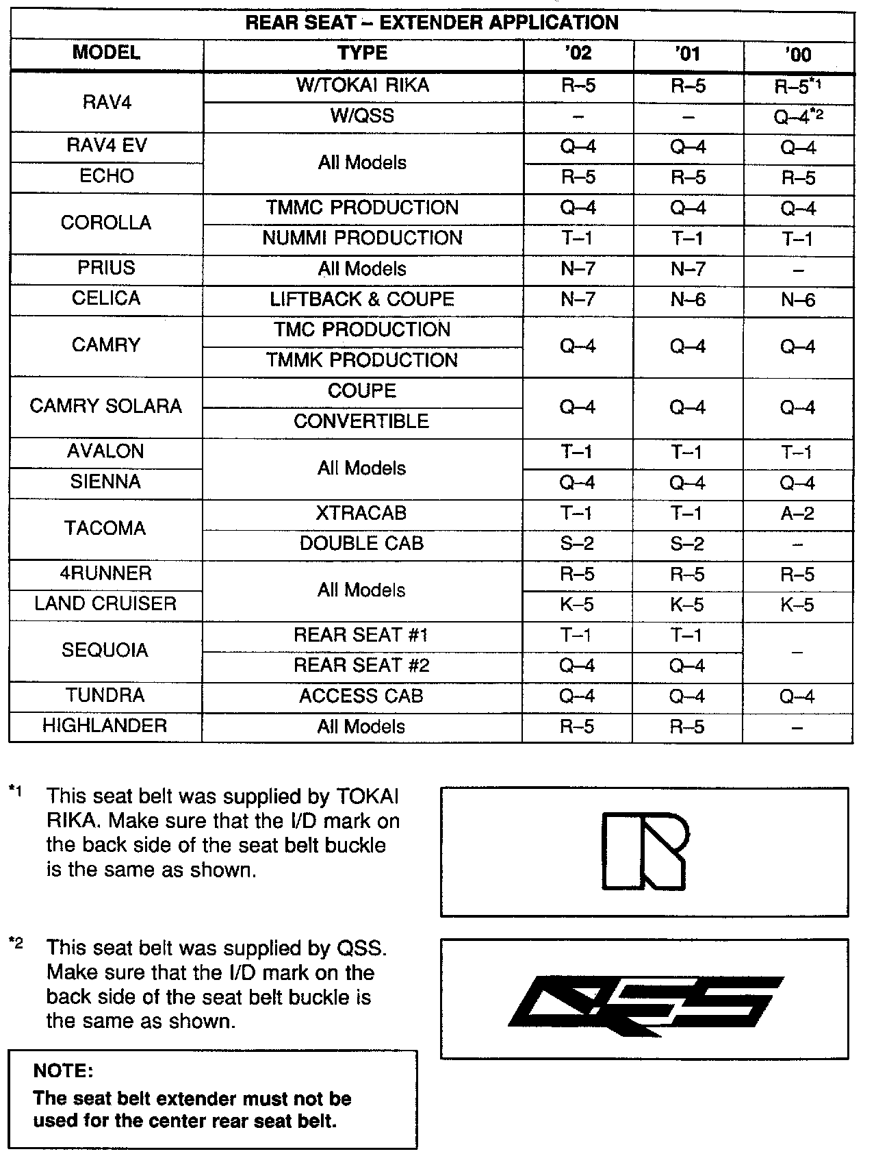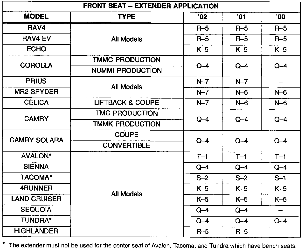 ^ Owners are informed of the Seat Belt Extender availability through the Toyota Owner's Manual included in each vehicle.