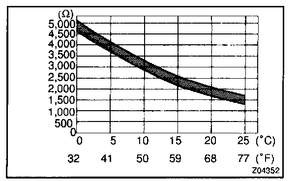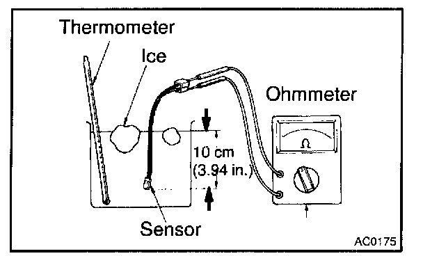 1. Place the sensor in cold water, and while changing the temperature of the water, measure resistance at the connector and at the same time, measure temperature of the water with a thermometer.