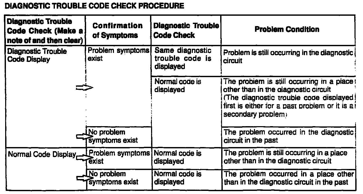 For this reason, the diagnostic trouble codes should be checked before and after the symptom confirmation to determine the current conditions, as shown in the table. If this is not done, it may, depending on the case, result in unnecessary troubleshooting for normally operating systems, thus making it more difficult to locate the problem, or in repairs not pertinent to the problem. Therefore, always follow the procedure in correct order and perform the diagnostic trouble code check.