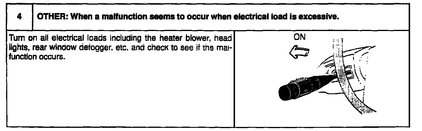 In the symptom simulation test, the problem symptoms should of course be confirmed, but the problem area or parts must also be found out. To do this, narrow down the possible problem circuits according to the symptoms before starting this test and connect a tester beforehand. After that, carry out the symptom simulation test, judging whether the circuit being tested is defective or normal and also confirming the problem symptoms at the same time.