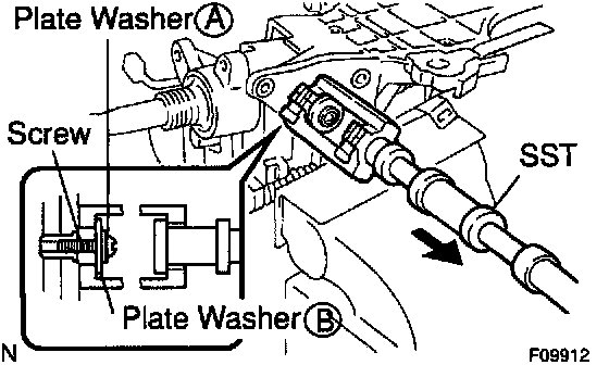 a. Set SST, plate washer (18 and 36 mm outer diameter) and screw (4.0 mm diameter, 0.7 mm pitch, 15.0 mm length), as shown in the illustration. And then remove the 2 No. 2 tilt steering bolts.