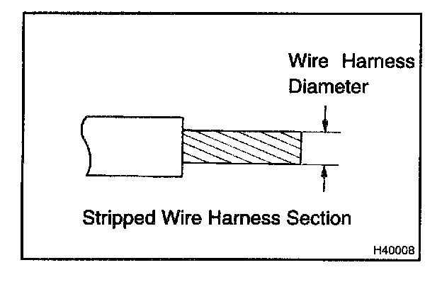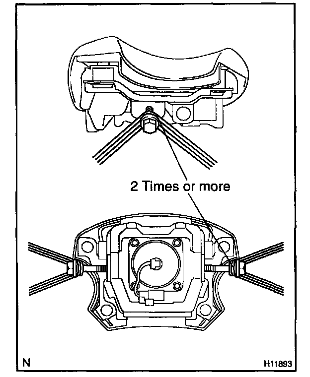 CAUTION: If a wire harness which is too thin or some other thing is used to tie down the steering wheel pad, it may be snapped by the shock when the airbag is deployed. This is highly dangerous. Always use a wire harness for vehicle use which is at least 1.25 sq.mm (0.0019 sq.in).