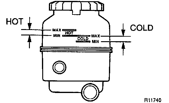 HINT: Check that the fluid level is within the HOT LEVEL range on the reservoir. If the fluid is cold, check that it is within the COLD LEVEL range.