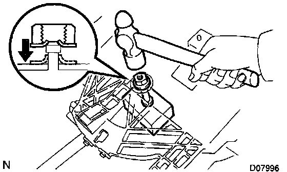 NOTICE: When pressing in the grooved pin, if doing it at the place other than the notch, the shift lever sub-assembly might be damaged.