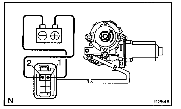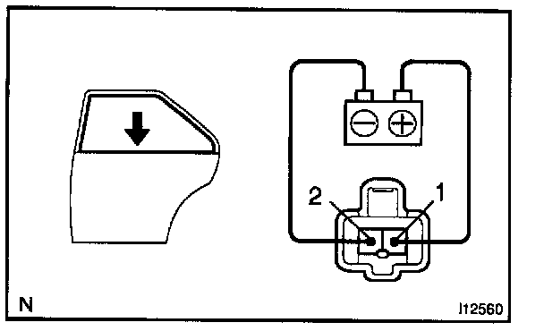 f. Approximately 60 seconds later, connect the positive (+) lead from the battery to terminal 2 and the negative (-) lead to terminal 1, and check that the window begins to descend.