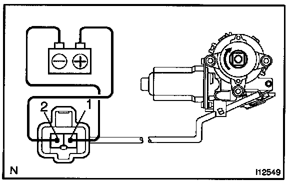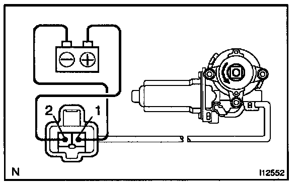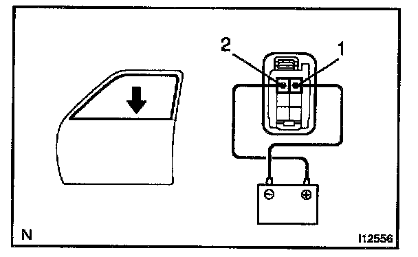 f. Approximately 60 seconds later, connect the positive (+) lead from the battery to terminal 2 and negative (-) lead to terminal 1, and check that the window begins to descended.