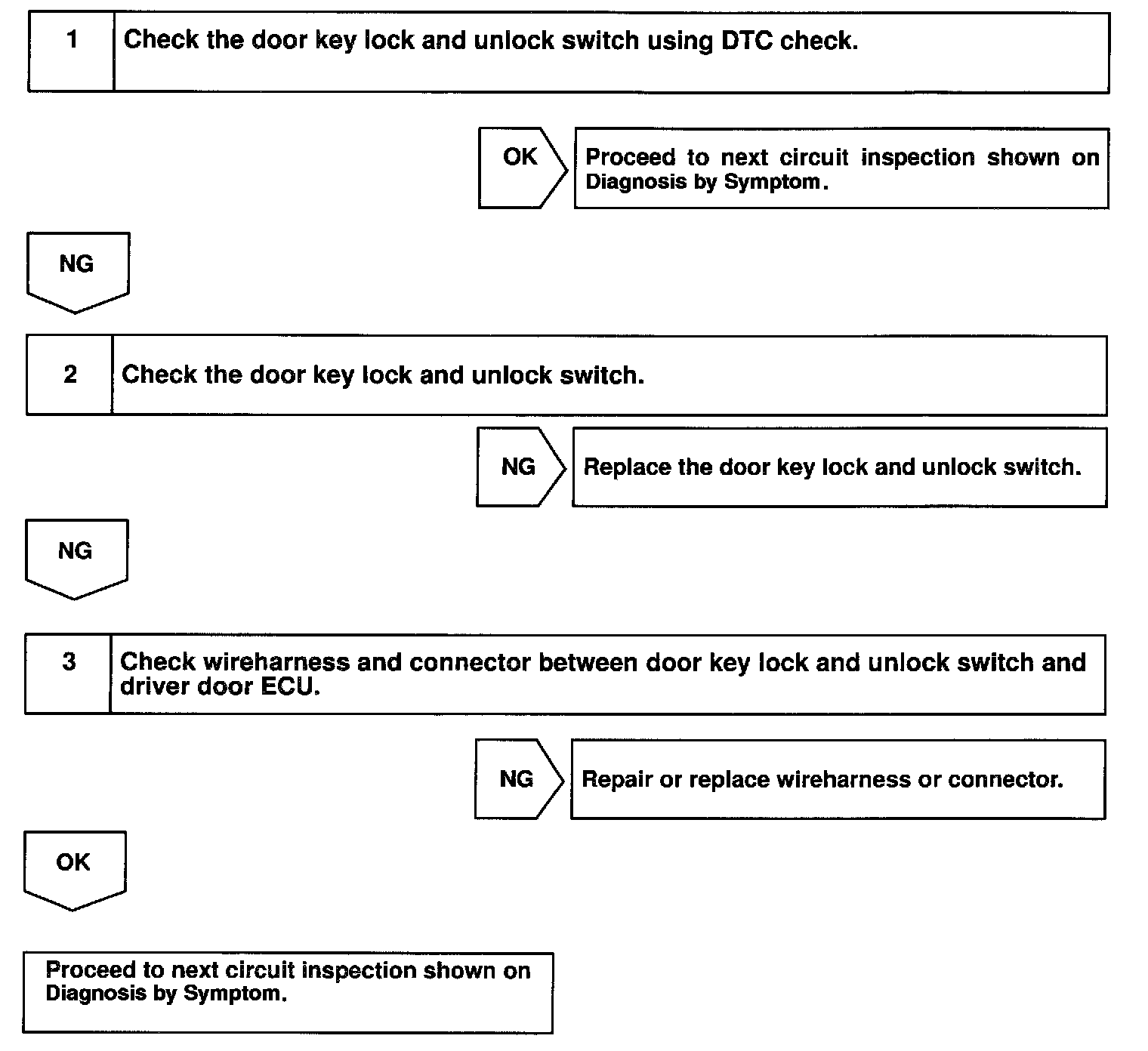CIRCUIT DESCRIPTIONThe door key lock and unlock switch is built in the door key cylinder. When the key is turned to the lock side, terminal 3 of the switch is grounded and when the key is turned to the unlock side, terminal 2 of the switch is grounded.