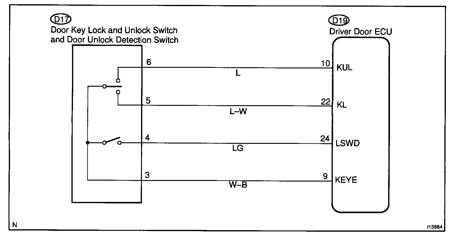 CIRCUIT DESCRIPTIONThe door unlock detection switch is built in the door lock motor assembly. This switch is ON when the door lock knob is in the unlock position and OFF when the lock knob is in the lock position. The ECU detects the door lock knob conditions is this circuit. It is used as one of the operating conditions for the key confinement prevention function.