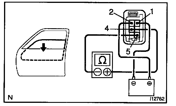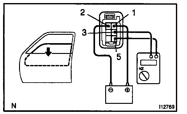 f. Approximately 60 seconds later, connect the positive (+) lead from the battery to terminal 2 and negative (-) lead to terminal 1, and check that the window begins to descended.